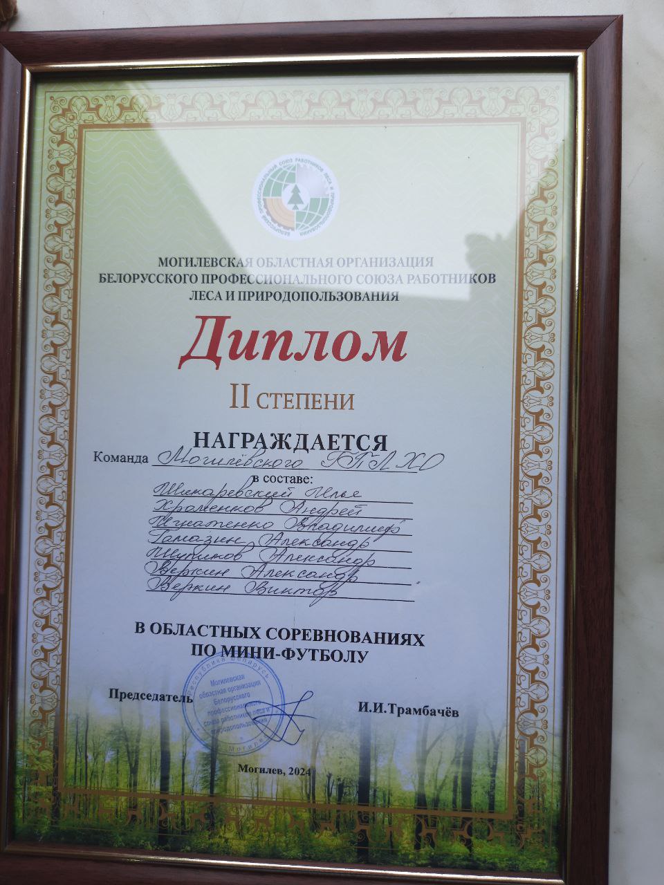 со вторым местом в областных соревнованиях по мини-футболу среди организаций, входящих в состав Могилевского областного Белорусского профессионального союза работников леса и природопользования.