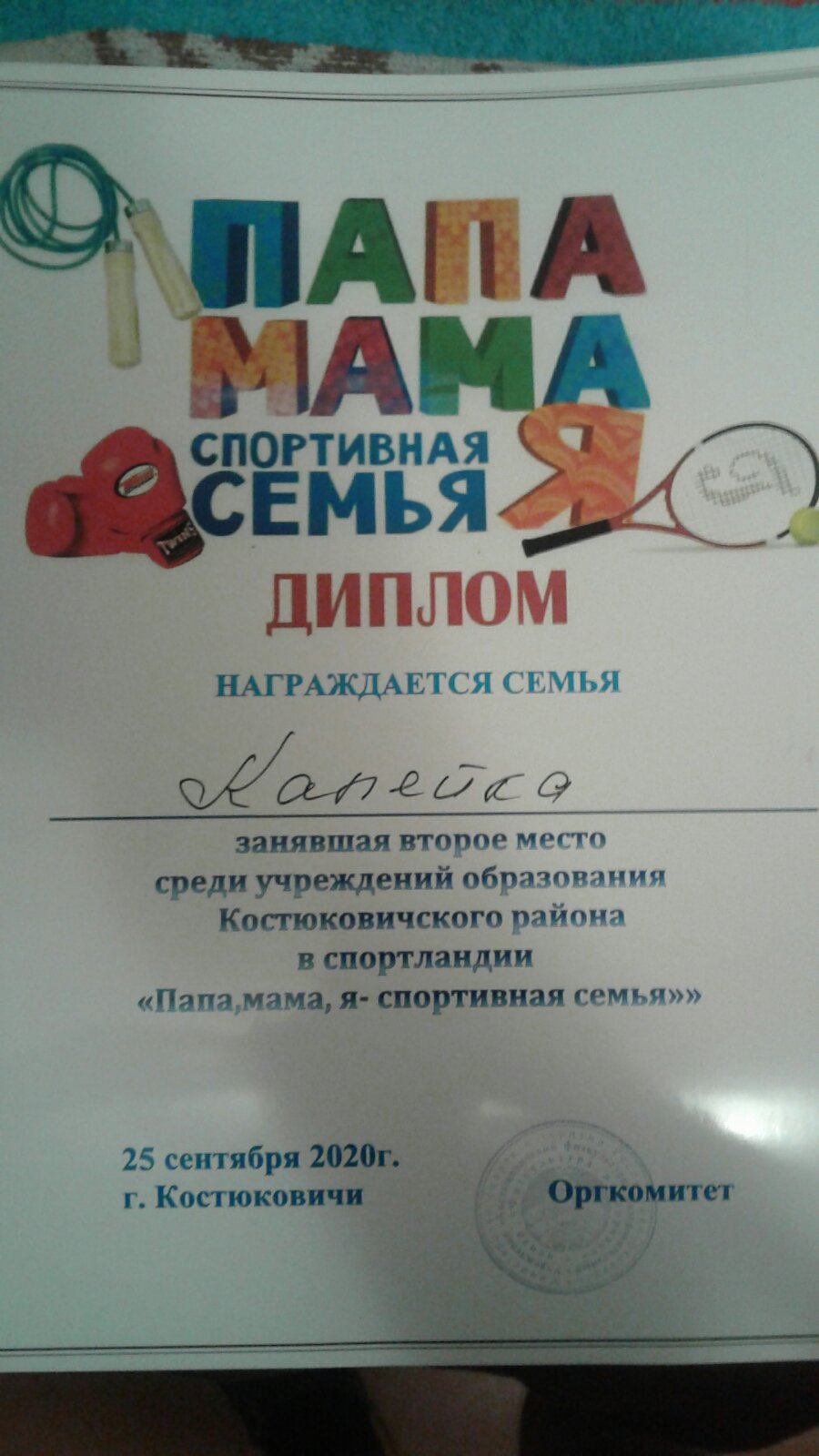 Валерия и Антонину Капейка можно по праву назвать одними из самых позитивных участников спортивно-массовых и культурно-развлекательных мероприятий, проводимых в Костюковичском лесхозе. Он – начальник пожарно-химической станции, она – техник-радиолог. Семья с активной жизненной позицией! Поэтому очередное приглашение от администрации школы, где обучается сын Михаил, принять участие в районной спортландии «Папа, мама, я – спортивная семья» они встретили с энтузиазмом. Соревнование проходило между командами учреждениями образования города, в состав которых входило по две семьи. Напарниками семьи Капейка, защищающих честь средней школы № 4, стала семья Ляховских. Совместными усилиями и стараниями они заняли почетное второе место. Дипломы и сладкие подарки участникам спортландии были вручены председателем Костюковичского райисполкома Александром Горбачевским.